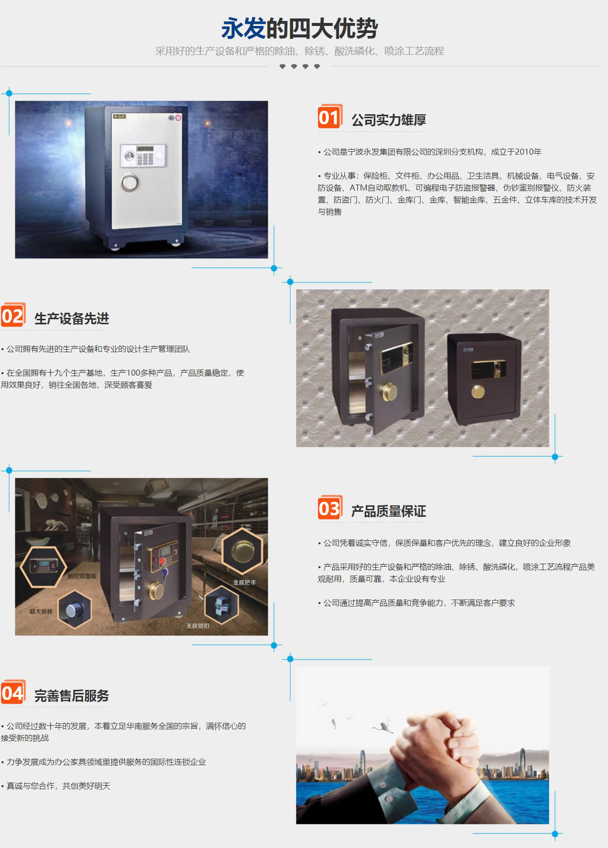 深圳永發(fā)安防產(chǎn)品有限公司 深圳永發(fā)安防產(chǎn)品有限公司,是寧波永發(fā)集團(tuán)有限公司的深圳分支機(jī)構(gòu),成立于2010年,專業(yè)從事:保險(xiǎn)柜、文件柜、辦公用品、衛(wèi)生潔具、機(jī)械設(shè)備、電氣設(shè)備、安防設(shè)備、ATM自動(dòng)取款機(jī)、可編程電子防盜報(bào)警器、偽鈔鑒別報(bào)警儀、防火裝置、防盜門(mén)、防火門(mén)、金庫(kù)門(mén)、金庫(kù)、智能金庫(kù)、五金件、立體車庫(kù)的技術(shù)開(kāi)發(fā)與銷售。